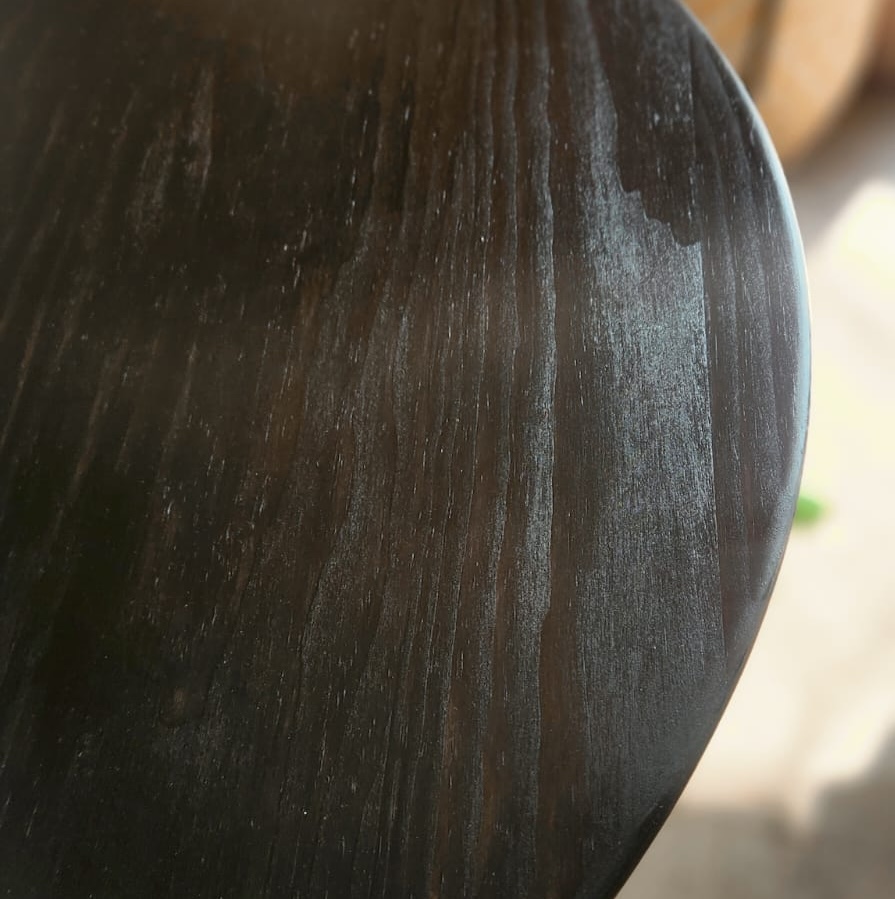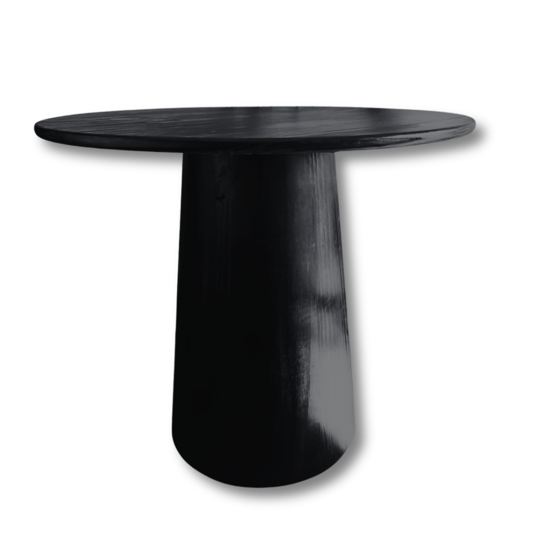 Mesa con cubierta Circular con base cónica de pino y pintada negra con cera Osmo.